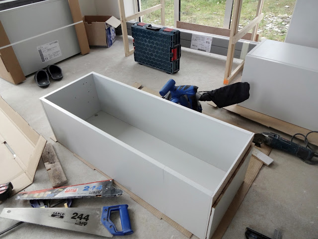 We used marine ply (very resistant to moisture) fitted into the recess to provide a solid base for the tray. If we had calculated correctly, it should finish up at exactly the same level as the height of the tiles (plus the adhesive).
